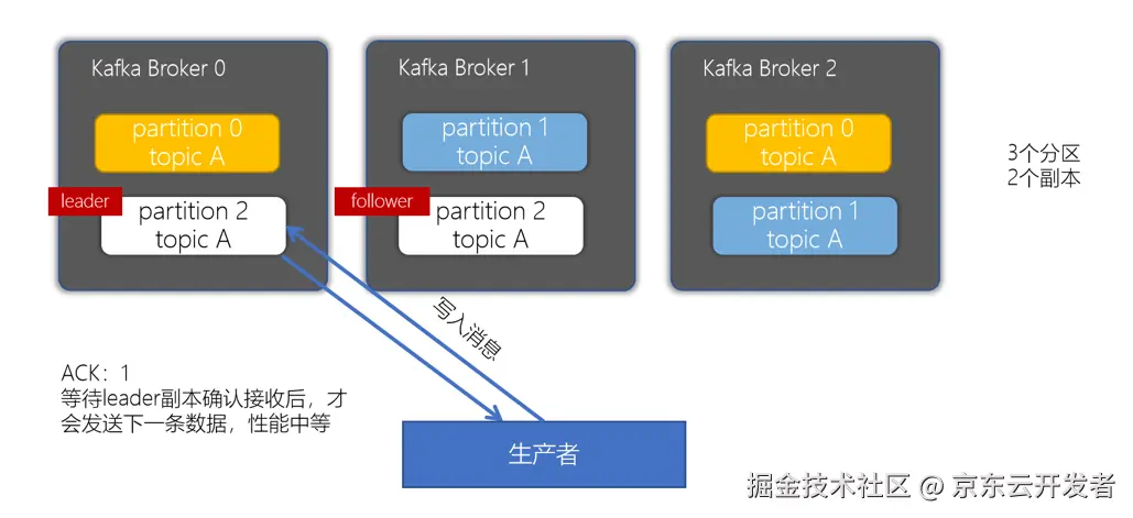 •acks = 1:生产者会等到leader分区写入成功后,返回成功,接着发送下一条