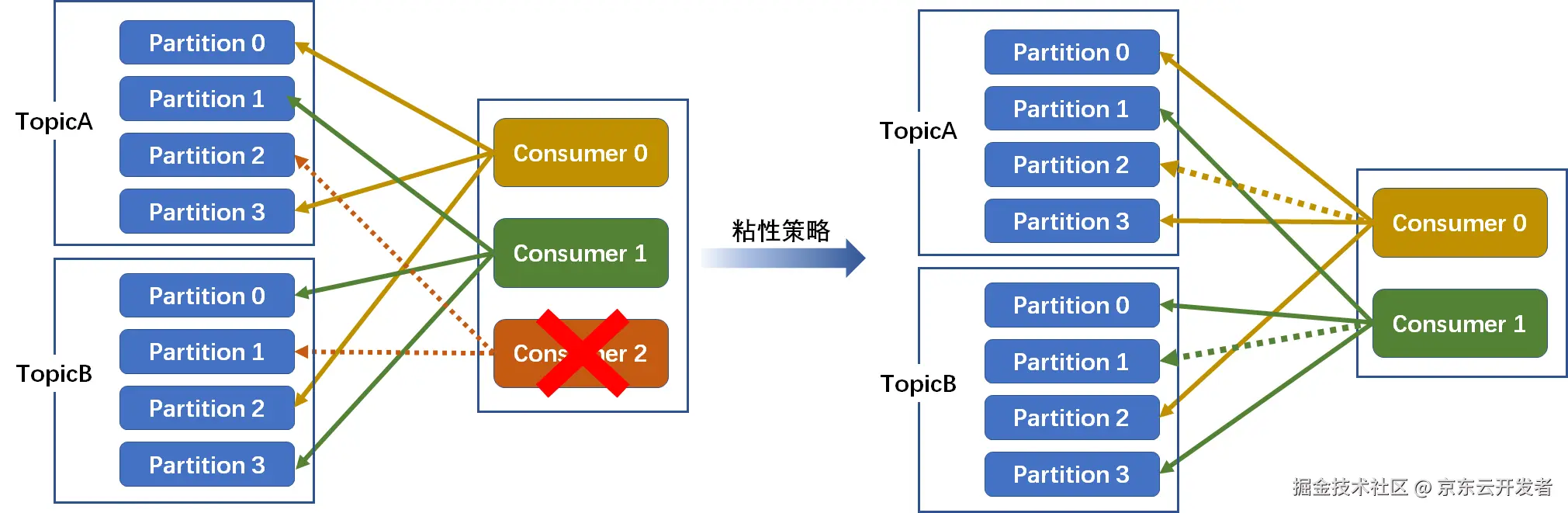 发生了rebalance(例如Consumer2故障宕机),轮询分配策略,重新走一遍轮询分配的过程。而粘性会保证跟上一次的尽量一致,只是将新的需要分配的分区,均匀的分配到现有可用的消费者中即可,这样就减少了上下文的切换