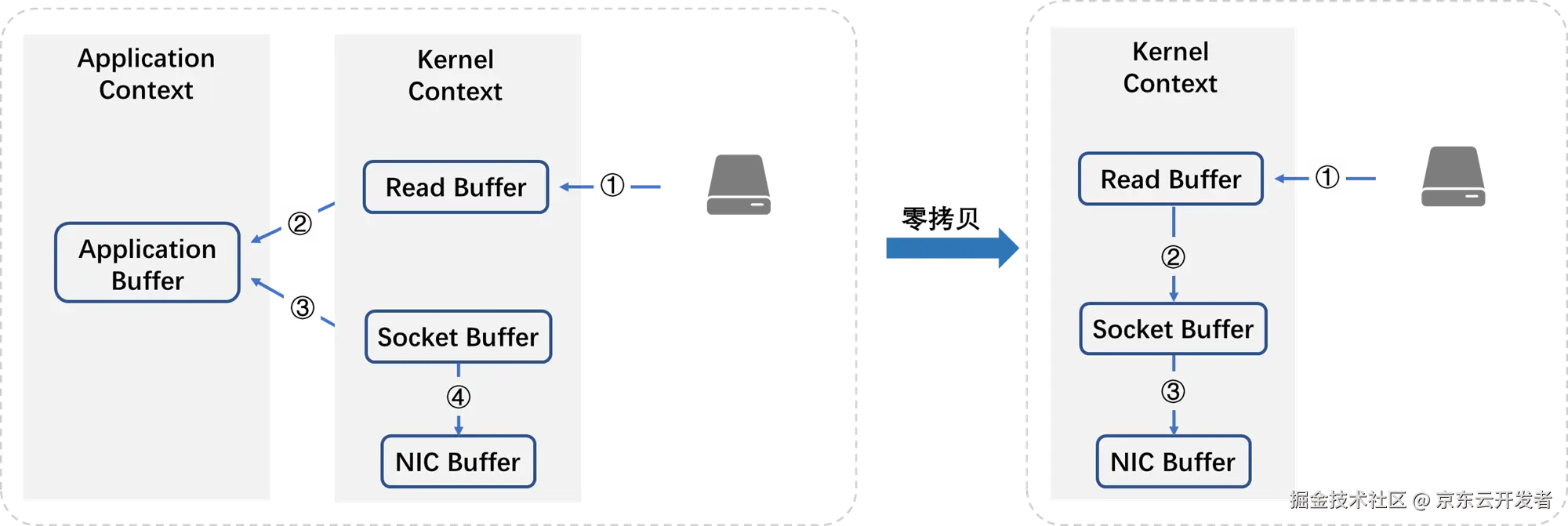 在这个过程中,可以发现, 数据从磁盘到最终发出去,要经历4次拷贝,而在这四次拷贝过程中, 有两次拷贝是浪费的。