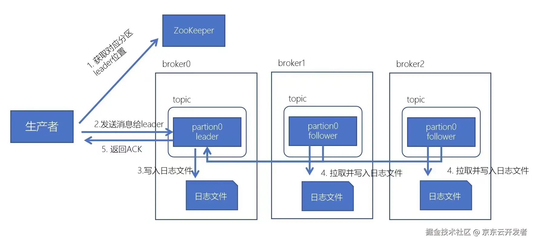 3.follower从leader上拉取消息,写入到本地log,并向leader发送ACK