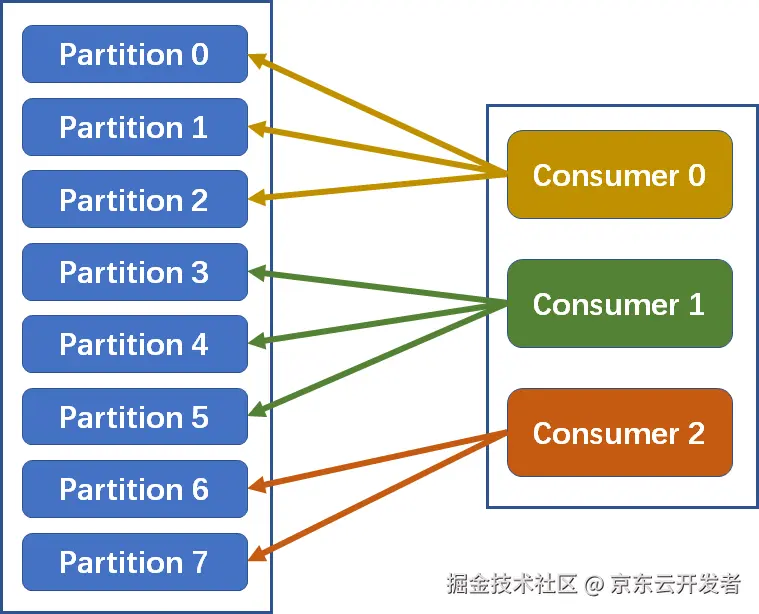 以上图为例:n=8/3=2m=8%3=2因此前2个消费者消费2+1=3个分区,剩下1个消费者消费2个分区