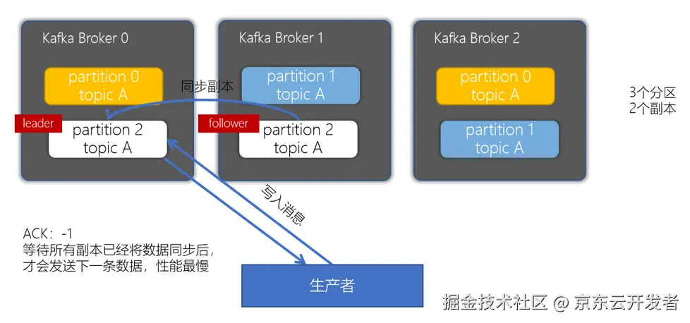 •acks = -1/all:确保消息写入到leader分区、还确保消息写入到对应副本都成功后,接着发送下一条,性能是最差的