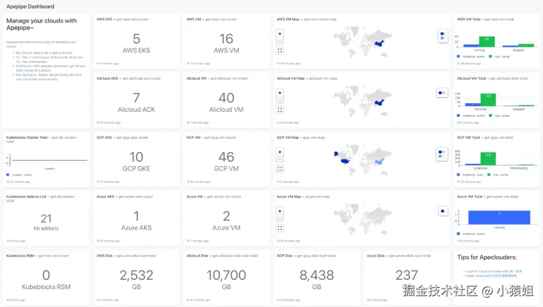 通过 dashboard 可以大屏一览所有云资源的情况,也可以详细定位查询某个云资源,无需在多云多账号中切换。