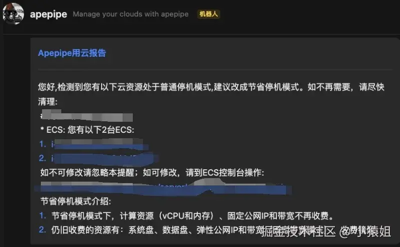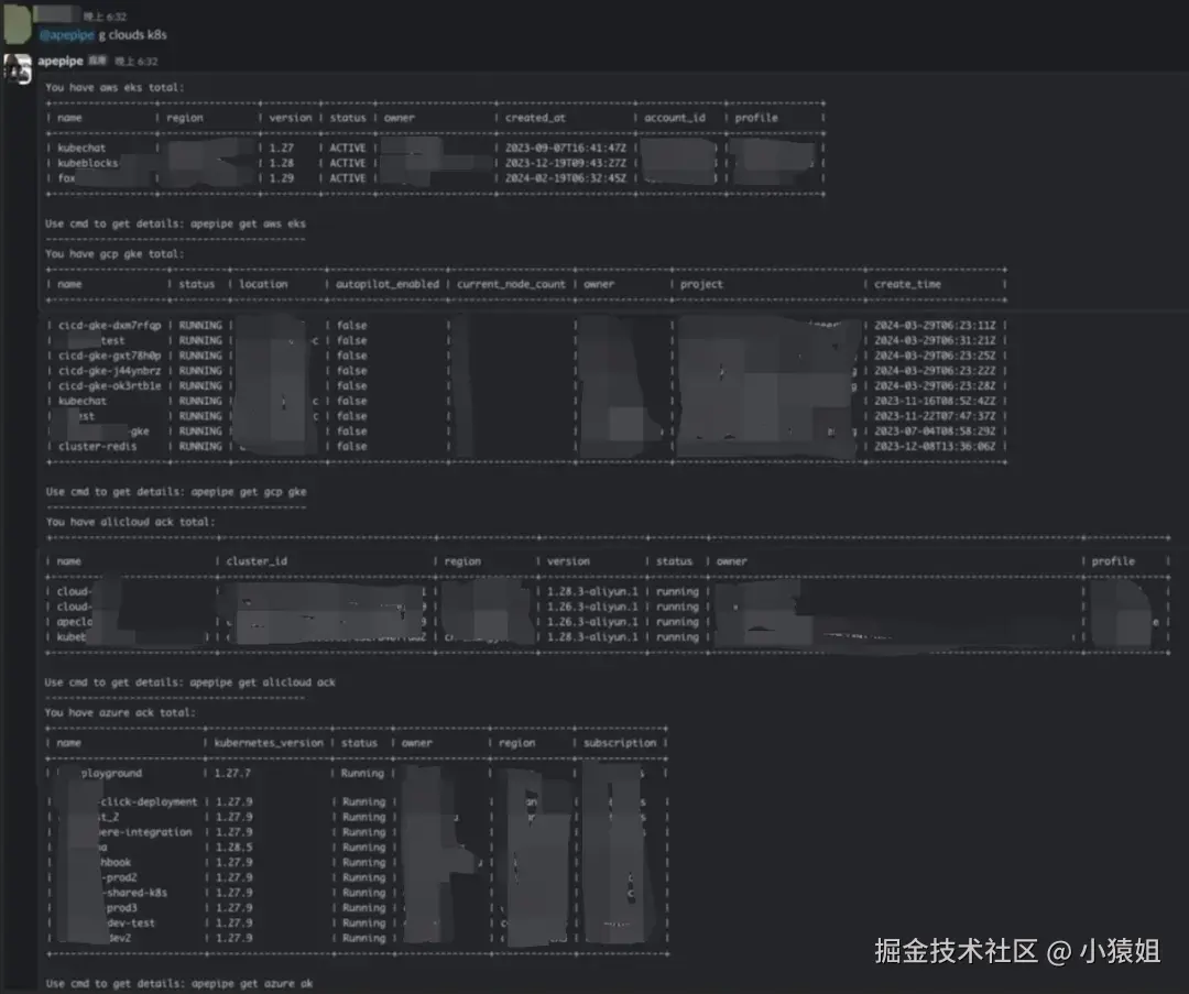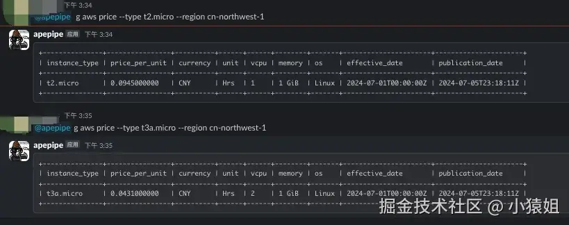 Apepipe Bot 也可以用 ChatOps 的方式调用 CLI 的所有命令,比如查看云资源、删除云资源、或查实例的价格,这样当你躺在沙滩上时,随便打开飞书、Slack 等就可以轻松管理所有云的云资源了: