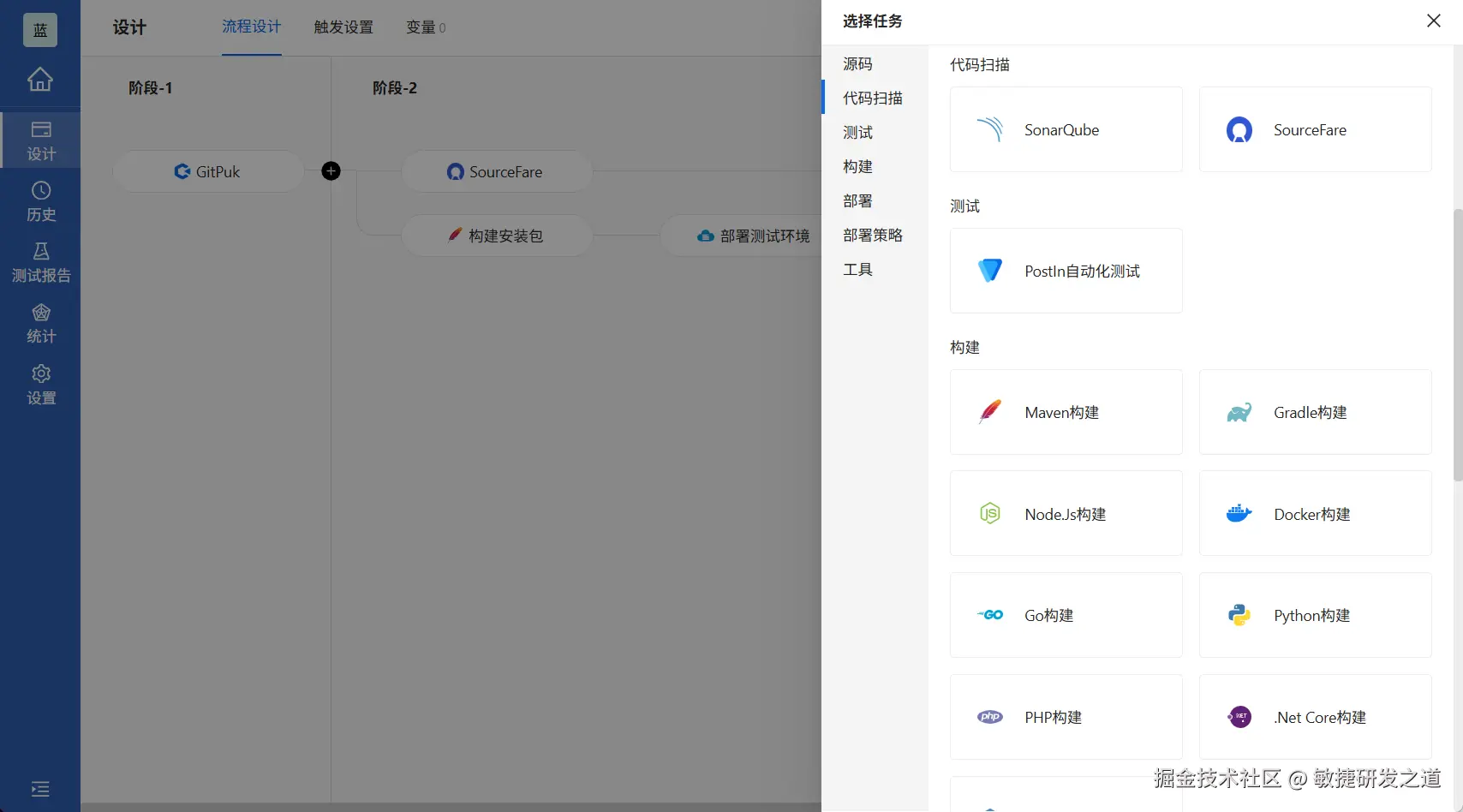 - 支持丰富多样的任务类型,如源码,代码扫描,测试,构建,拉取制品,推送制品,部署等各种类型,支持各种主流开源工具集成。