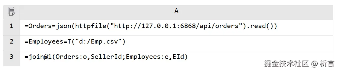 join@1(json(httpfile("http://127.0.0.1:6868/api/orders").read()):o,SellerId; T("d:/Emp.csv"):e,EId)