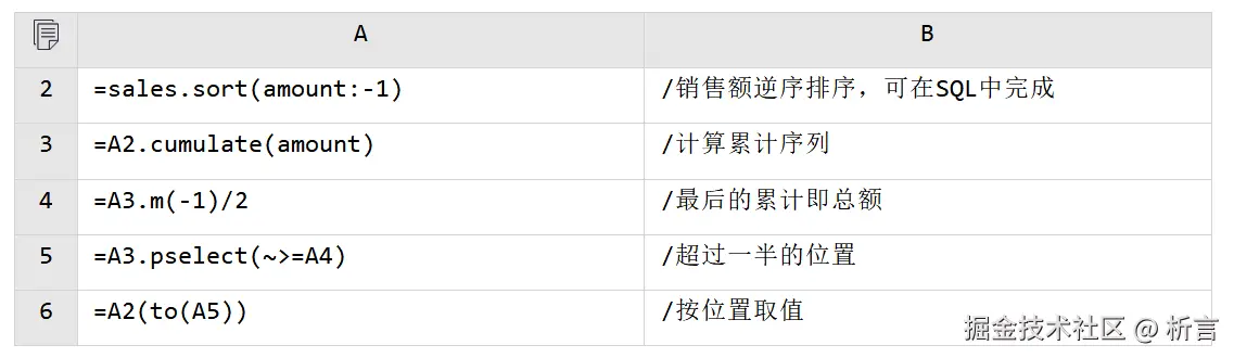 SQL 很难处理恰好要过线的客户,只能换个方法变相实现,即计算销售额从小到大的累计值,反过来找出累计值不在后一半的客户。这种方法技巧性强,代码冗长,而且难以调试。