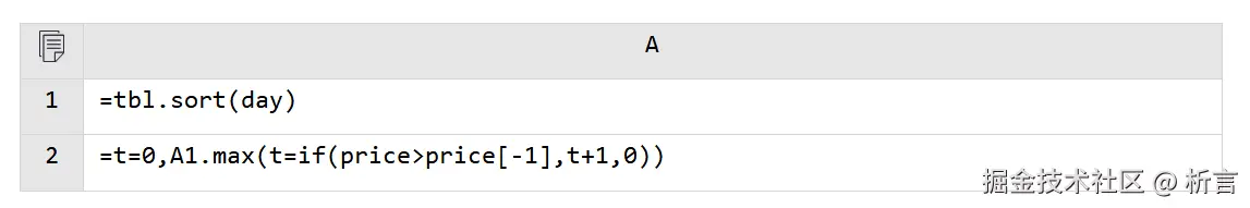 SPL 容易表达连续上涨的概念,先按日期排序;再遍历记录,发现上涨则计数器加 1。这里既用到了循环函数 max,也用到了有序集合,代码中 [-1] 表示上一条,是相对位置的表示方法,price[-1]表示上一个交易日的股价,比整体移行(lag 函数)更直观。