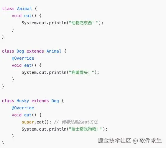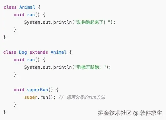 - 调用父类的方法:super.方法名()可以直接调用父类的普通方法,甚至是在重写时保留父类的逻辑。