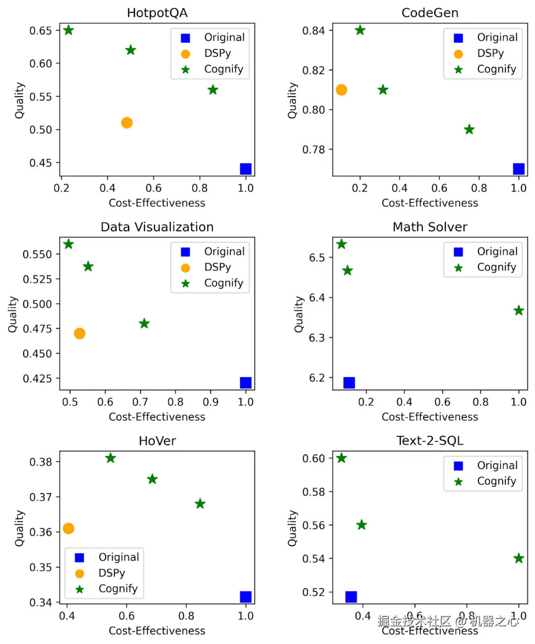 对于不同的应用场景,Cognify 都用相同或更小的模型达到了更高的生成质量,推动了质量 - 成本 Pareto 边界,并且允许用户选择不同的质量 - 成本组合(结果如下图所示)。在此过程中,Cognify 的优化实现了「一键」全自动化。