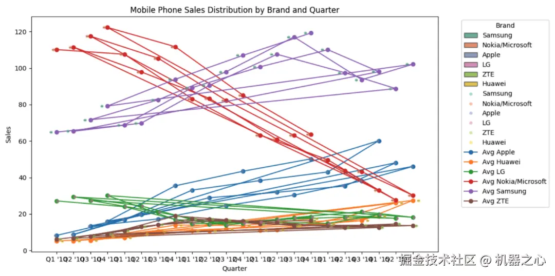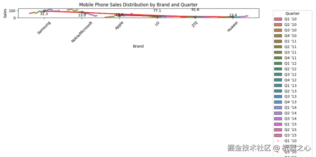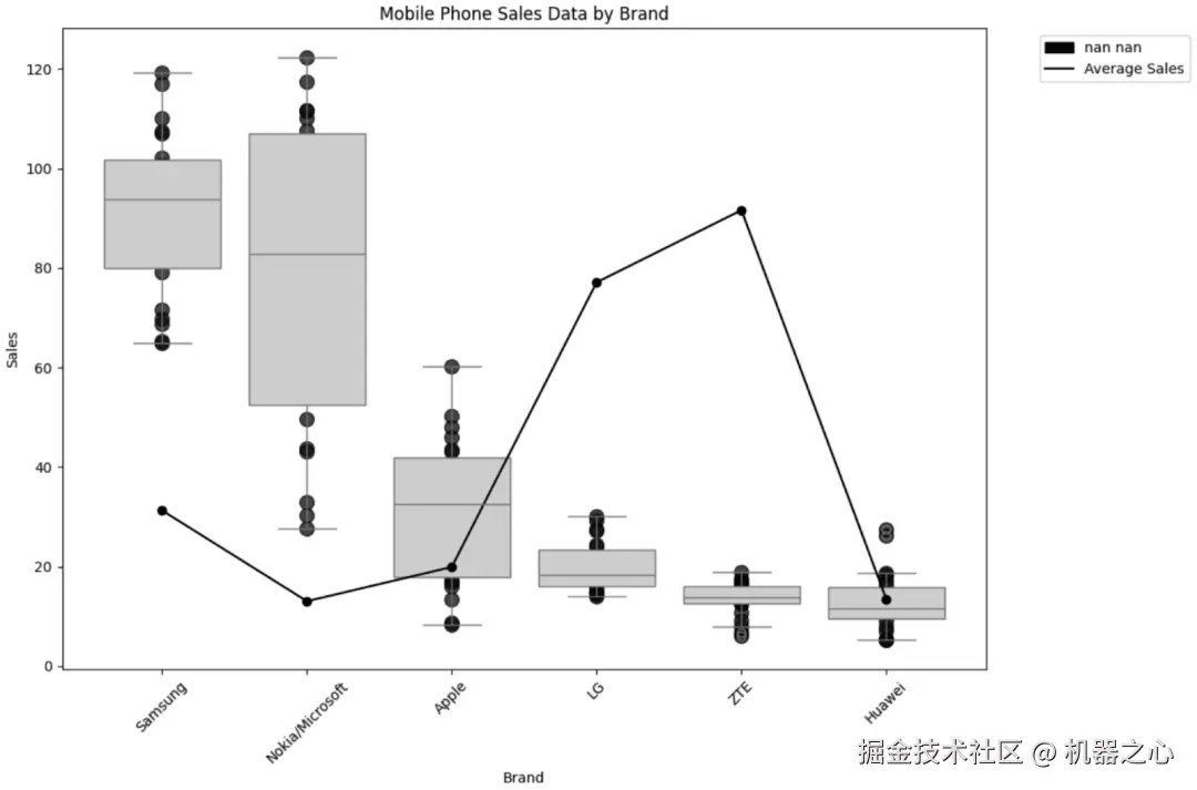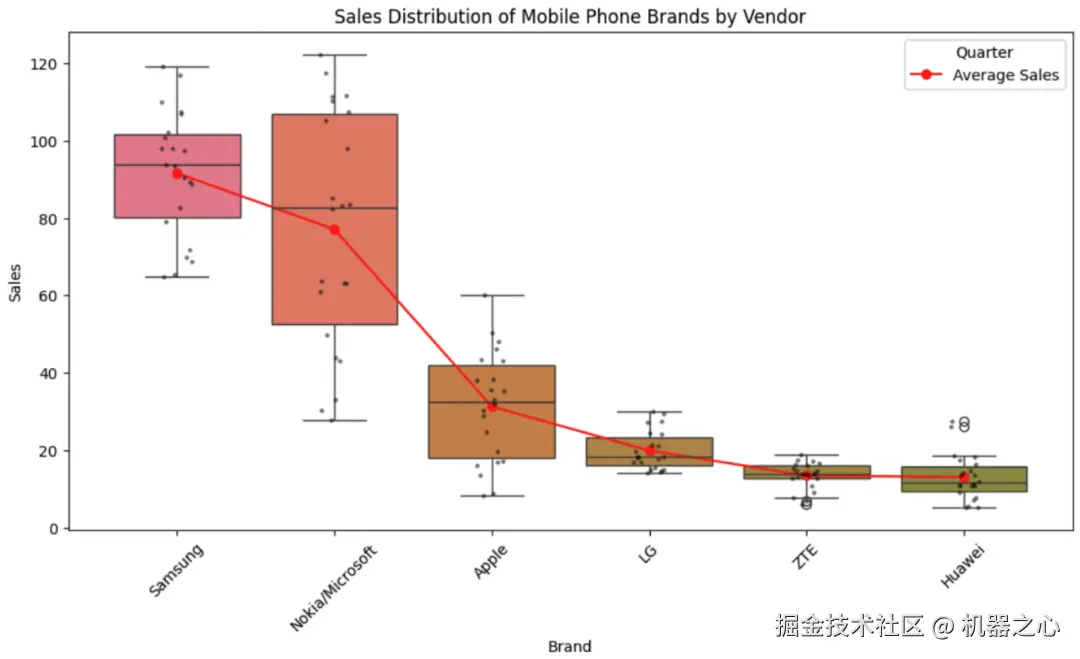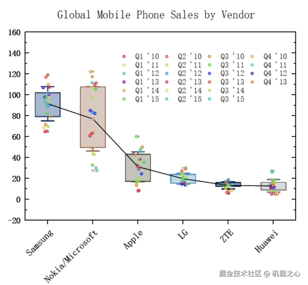 以下是一个数据可视化任务的例子。任务目标是由手机销售数据生成针对每个厂商每个季度的销量的箱型图,并计算每个手机商的销售平均值,最终用平均值线表示。