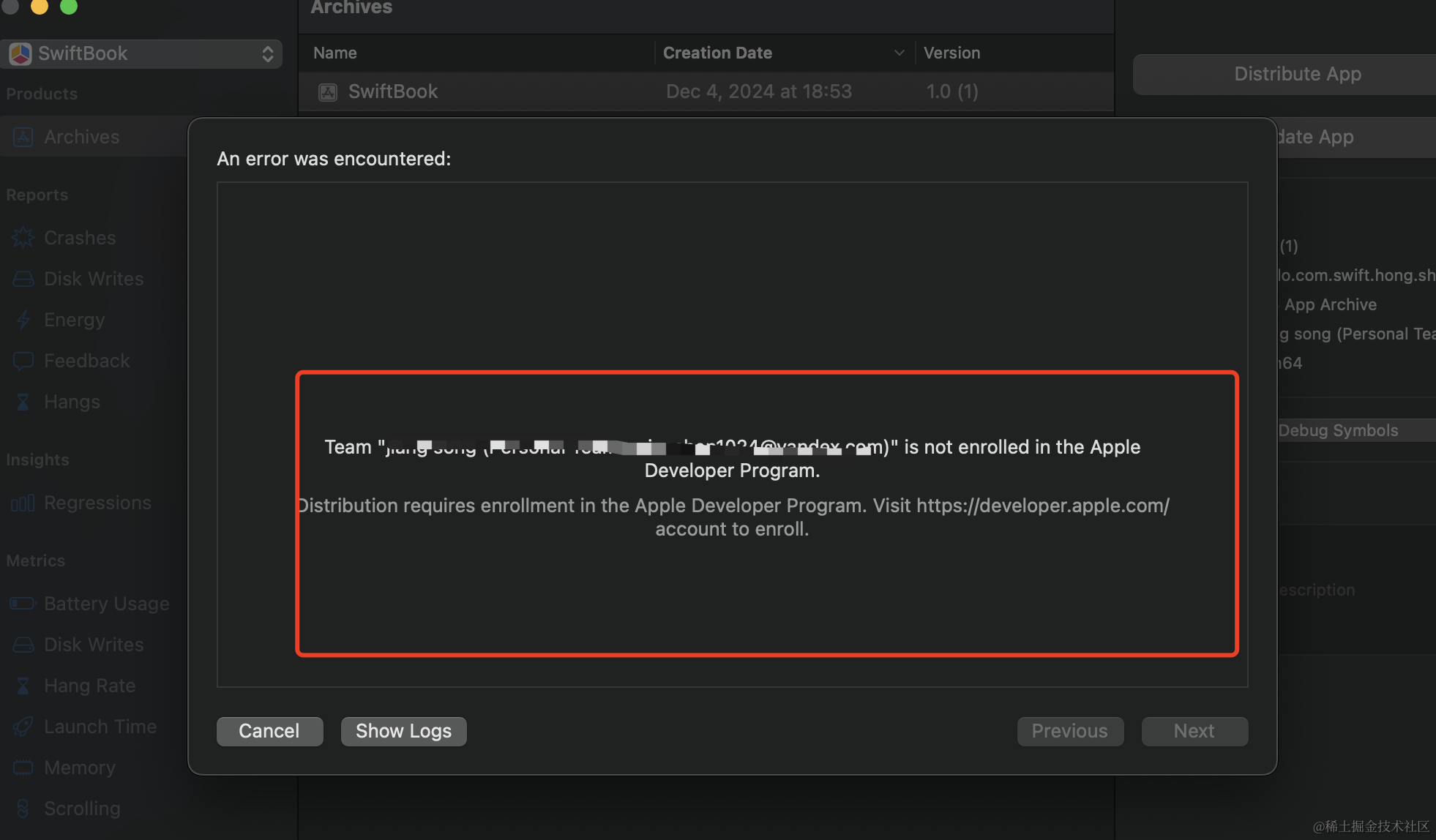 xcode archive XXX is not enrolled in the Apple Developer Program. 1024小神 2024-12-04 277 阅读1分钟 在xcode中想导出一个ipa包的时候,提示: Team "XXX (Personal Team - XXX)" is not enrolled in the Apple Developer Program. 这是因为我的账号没有付费购买苹果的苹果开发者计划,好吧。。。。。 所以打包的时候 打包时候选择的Team必须是已付费且加入苹果开发者计划的的Team 只有付费的开发者账号才可以打包出来,免费的账号只能直接连真机测试。
