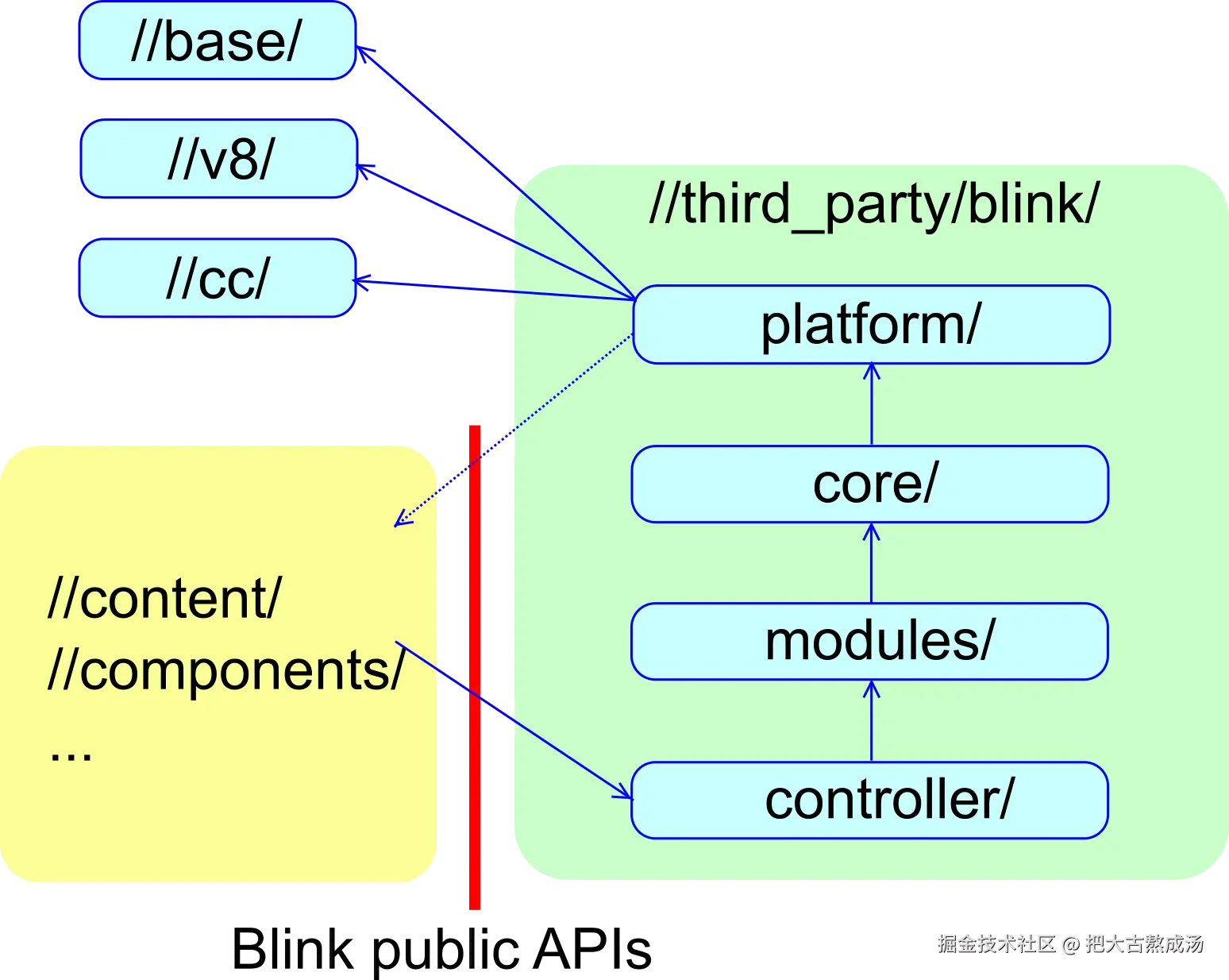 - Chromium => controller/ => modules/ and bindings/modules/ => core/ and bindings/core/ => platform/ => low-level primitives such as //base, //v8 and //cc