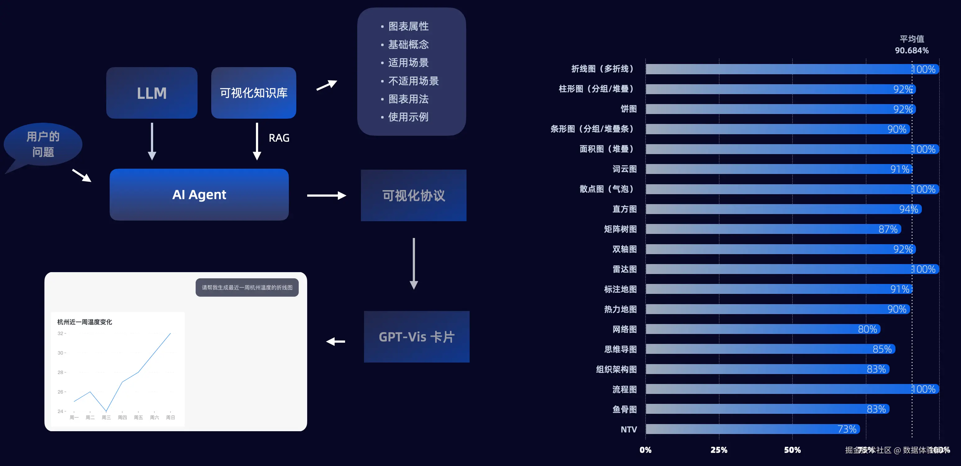 - 📈 LLM 接入:面向 LLM 无缝接入的图表知识库和图表推荐模型,针对 LLM 直接输出可视化卡片,为 Agent 提供知识库以及推荐模型方案。