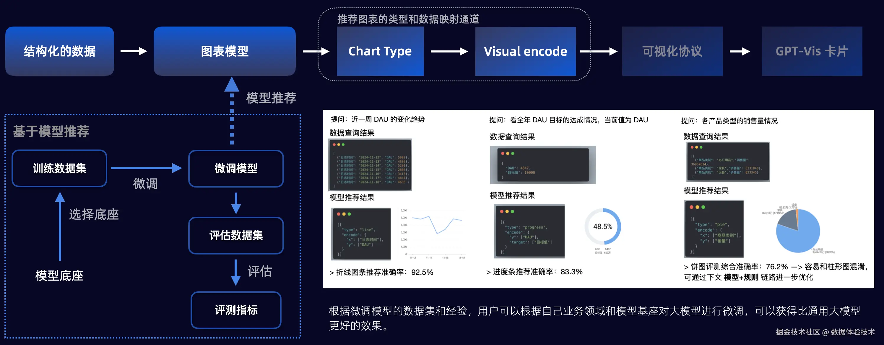 针对结构化数据的输入,我们依据过去的经验,升级了图表推荐模型方案。通过收集训练数据集,利用模型基座对大模型进行微调,以训练图表推荐模型,利用可视化图表模型生成适当的图表类型和编码,相较于通用大模型输出,准确率有了显著的提升,根据评测数据集对效果进行衡量,推荐成功率达 90%+。