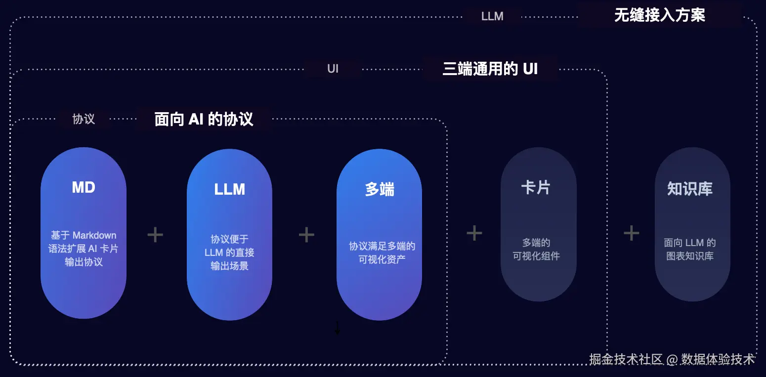 - 🤖 LLM 协议:面向 LLM Agent 卡片的可视化协议,针对 LLM 对话式交互,以及服务序列化输出而设计,方便快速集成到 AI 应用中。
