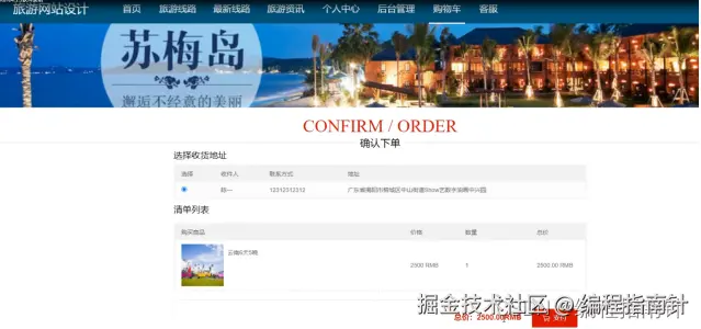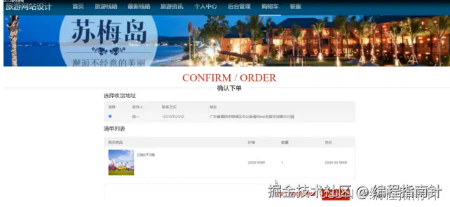 旅游线路:通过列表可以进行查看路线名称、价格、路线分类、景点名称、出发地、目的地、交通方式、出行时间、费用包含、点击次数等信息、进行添加购物车或立即购买、收藏操作,如图5-11所示。用户通过点击立即购买进入页面可以进行选择收货地址进行查看订单信息,进行在线支付操作,如图5-12所示。