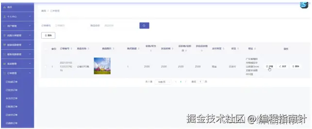 订单管理:管理员通过列表可以进行查看订单编号、商品名称、商品图片、购买数量、价格、折扣价格、总价格、支付类型、地址等信息,进行详情、发货或删除操作,并通过输入进行订单编号、商品名称操作,如图5-4所示。