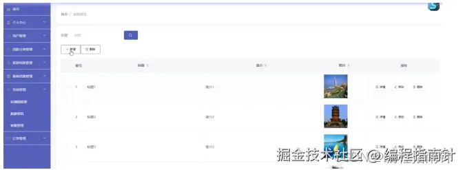 旅游资讯:管理员通过列表可以进行查看标题、简介、图片等信息,进行详情、修改或删除操作,并通过新增进行添加旅游资讯信息或删除操作,如图5-3所示。