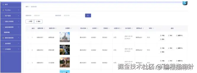 旅游路线管理:通过列表可以获取路线名称、路线分类、封面图、景点名称、出发地、目的地、交通方式、出行时间、费用包含、价格等信息,进行查看旅游详情或修改、查看评论操作,或新增、删除,如图5-2所示。