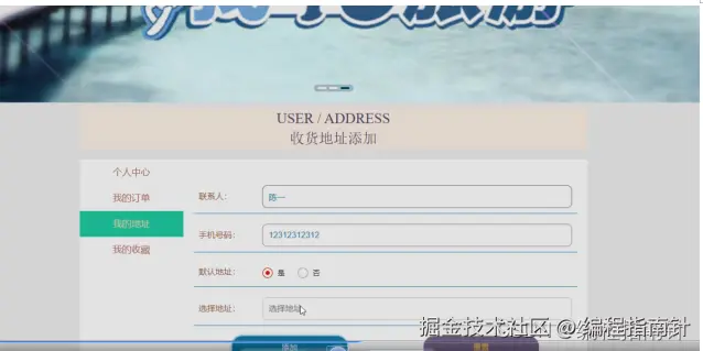 个人中心:通过列表可以进行查看个人中心、我的订单、我的地址、我的收藏等功能,进行相对应操作,个人中心:通过页面可以进行修改用户名、密码、姓名、头像、性别、联系电话、余额等信息,进行更新信息操作,如图5-8所示。我的地址:通过列表可以进行查看联系人、手机号码、默认地址等信息、进行添加地址或重置操作,如图5-9所示。