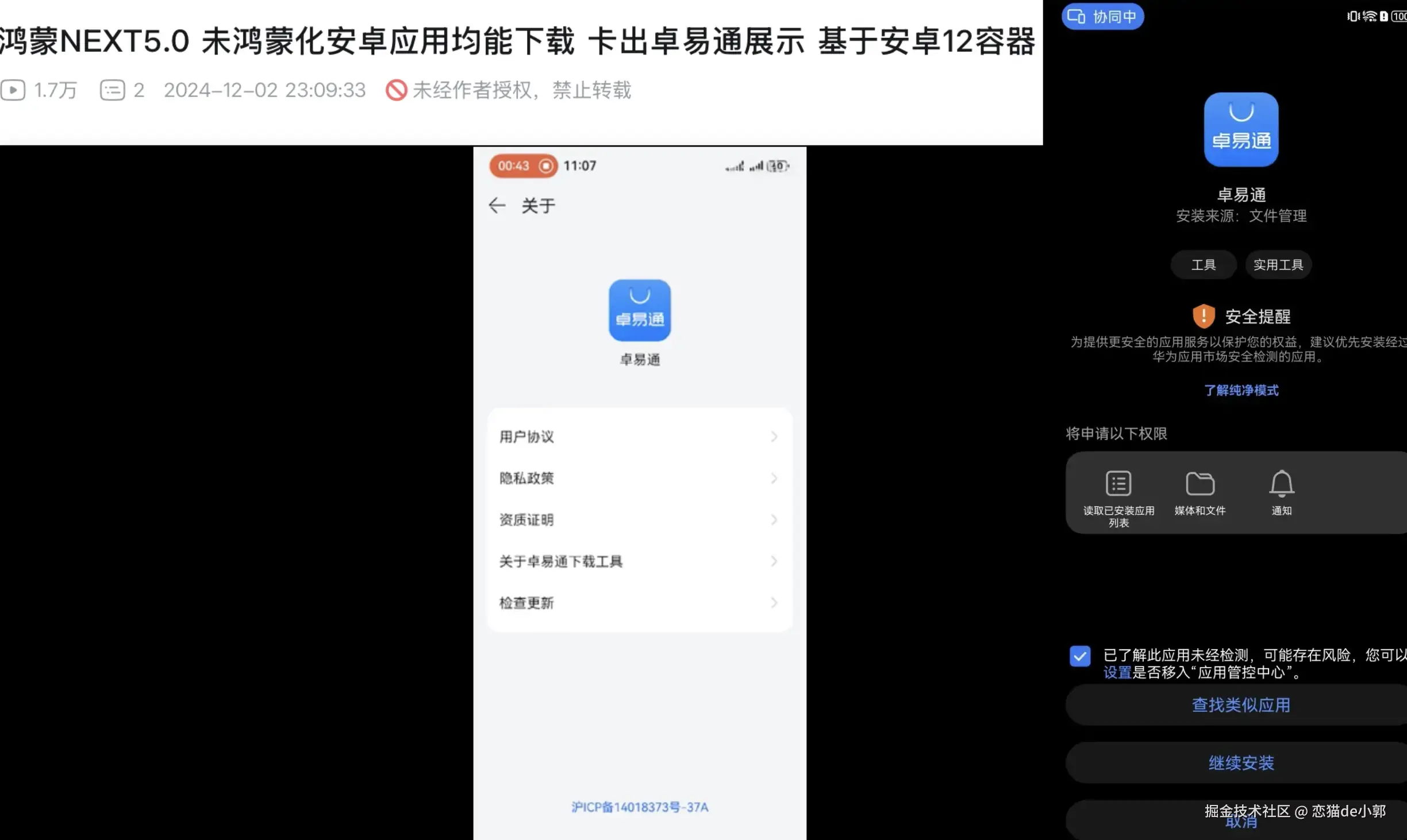 - 「卓易通」则使用黑名单方式,仅对鸿蒙 Next 上架的应用无法安装,也会检查签名