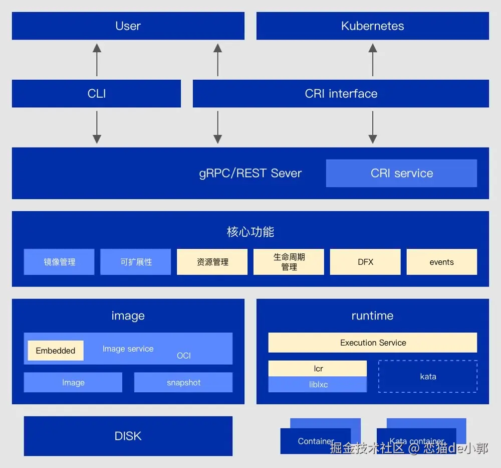- 北向接口:提供CRI接口,支持对接Kubernets;同时提供便捷使用的命令行
