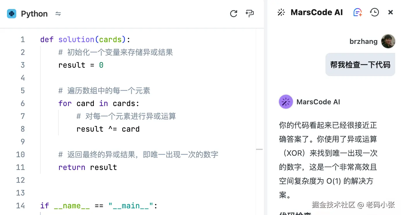 在写代码时,遇到卡壳是再正常不过的事。MarsCode 的 AI 助手就像个全天候陪伴的代码导师,不仅可以给你解题思路,还能帮你检查代码,甚至指出运行错误背后的深层原因。