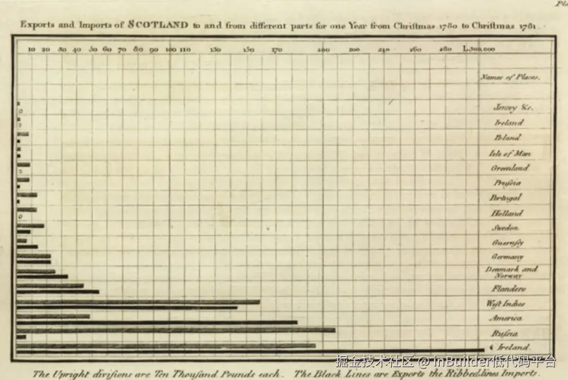 18世纪是统计图形学繁荣时期,其奠基人威廉·普莱菲尔发明了折线图、柱状图、饼状图、圆图。社会和科技进步相伴随的是数据的价值开始为人们所重视,人们不满足只在地图上展示几何图形,抽象图形和函数图形的功能被大大扩展,许多崭新的数据可视化形式在这个世纪诞生了。