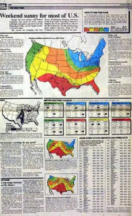 1982年乔治·罗里克(George Rorick)绘制彩色天气图开创了报纸上的彩色信息图形时代。现代电子计算机的诞生彻底地改变了数据分析工作,高分辨率的图形和交互式的图形分析,提供了手绘时代无法实现的表现能力。各种计算机系统,计算机图形学,图形显示设备,人机交互技术发展激发了人们可视化热情。数据密集型计算器走上了舞台,也造就了对数据分析和呈现的更高需求。