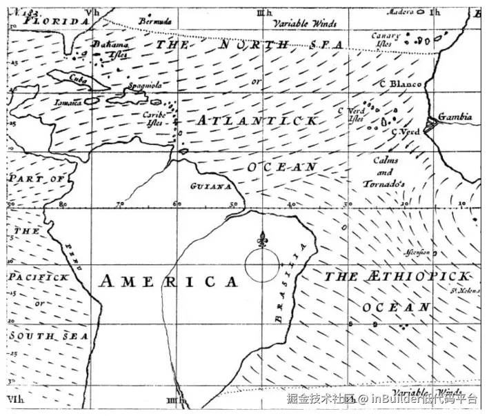 1686年,埃德蒙·哈雷绘制了第一幅已知的气象图,显示在地理地图上主流风场分布。这也是向量场可视化的鼻祖。随着17世纪解析几何、测量误差理论和概率论的诞生,到本世纪末,数据可视化方法必不可少的要素已经具备了,一些具有重大意义的真实数据以及视觉表现方法出现,人类开始了可视化思考的新模式,可以将本世纪视为可视化的开端。