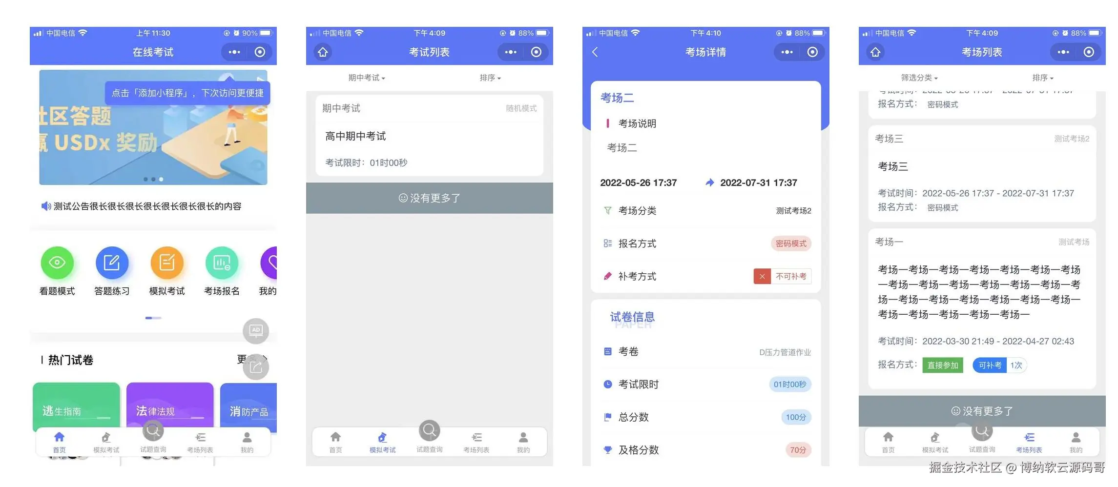 答题考试小程序系统,支持多种试题类型、多种试题难度、练题、考试、补考模式.