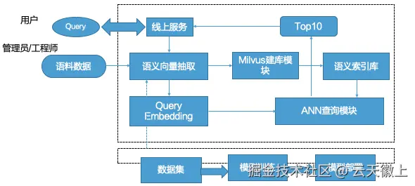 问答的流程分为两部分,第一部分是管理员/工程师流程,第二部分就是用户使用流程,在模型的层面,需要离线的准备数据集,训练模型,然后把训练好的模型部署上线。另外,就是线上搭建问答检索引擎,第一步把收集好的语料数据,利用训练好的模型抽取问题的向量,然后把向量插入到近似向量检索引擎中,构建语义索引库,这部分做完了之后,就可以使用这个问答服务了,但是用户输入了Query之后,发生了什么呢?第一步就是线上服务会接收Query后,对数据进行处理,并抽取用户Query的向量,然后在ANN查询模块进行检索匹配相近的问题,最终选取Top10条数据,返回给线上服务,线上服务经过一定的处理,把最终的答案呈现给用户。