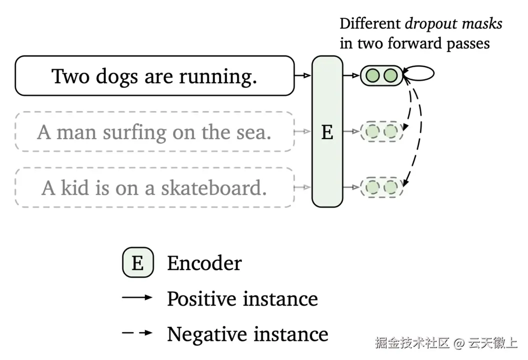 上图是SimCSE的原理图,SimCSE主要是通过dropout来把同一个句子变成正样本(做两次前向,但是dropout有随机因素,所以产生的向量不一样,但是本质上还是表示的是同一句话),把一个batch里面其他的句子变成负样本的。