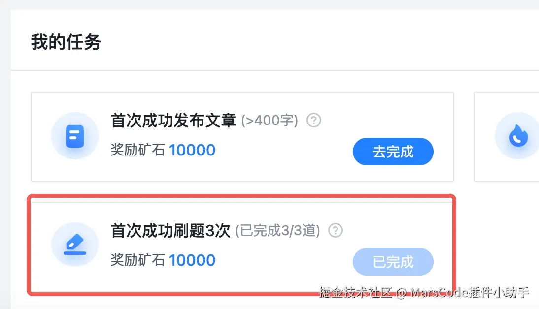 - 刷题老用户登录掘金,进入我的签到页面并完成日常刷题任务,每次可以拿到3000矿石任务奖励。