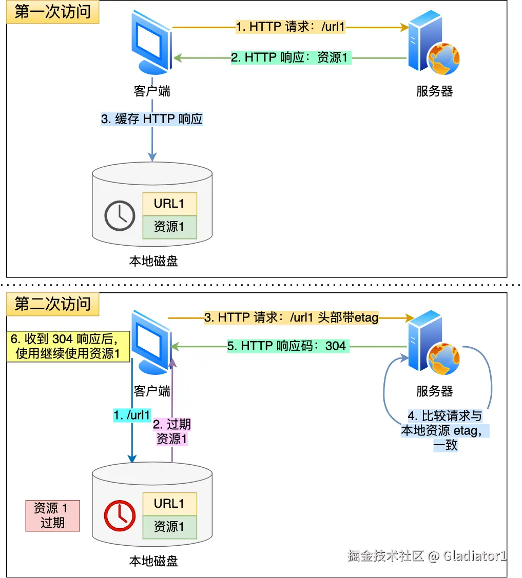 第一个思路是,通过缓存技术来避免发送 HTTP 请求。客户端收到第一个请求的响应后,可以将其缓存在本地磁盘,下次请求的时候,如果缓存没过期,就直接读取本地缓存的响应数据。如果缓存过期,客户端发送请求的时候带上响应数据的摘要,服务器比对后发现资源没有变化,就发出不带包体的 304 响应,告诉客户端缓存的响应仍然有效。