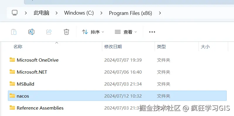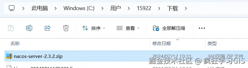 将这个压缩包解压到指定位置,这个位置就是Nacos的安装路径。这里需要注意,解压压缩包的路径不要含有中文和数字,且尽量不放在C盘下;但是一开始我没注意这一点,所以本文后面的截图中,都是将其放在了一个含有数字的路径下,如下图所示——这个是不正确的,大家注意即可。