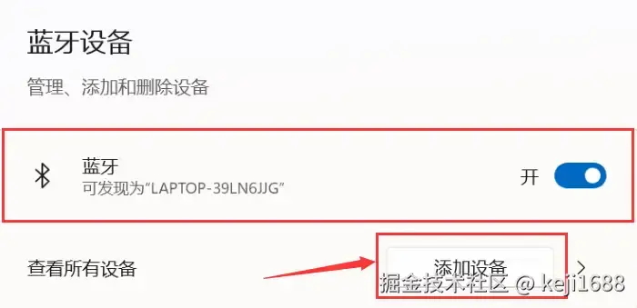 Windows系统:打开 【设置】 应用,选择 【设备】>【蓝牙和其他设备】 ,开启蓝牙。
