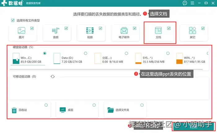 第1步: 在电脑上打开数据 蛙恢复专家,然后在首页上选择文档和ppt文件丢失的位置,最后点【扫描】;