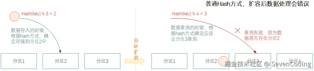 集群扩容的时候,会导致请求被分发到错误节点上,导致缓存命中率降低。