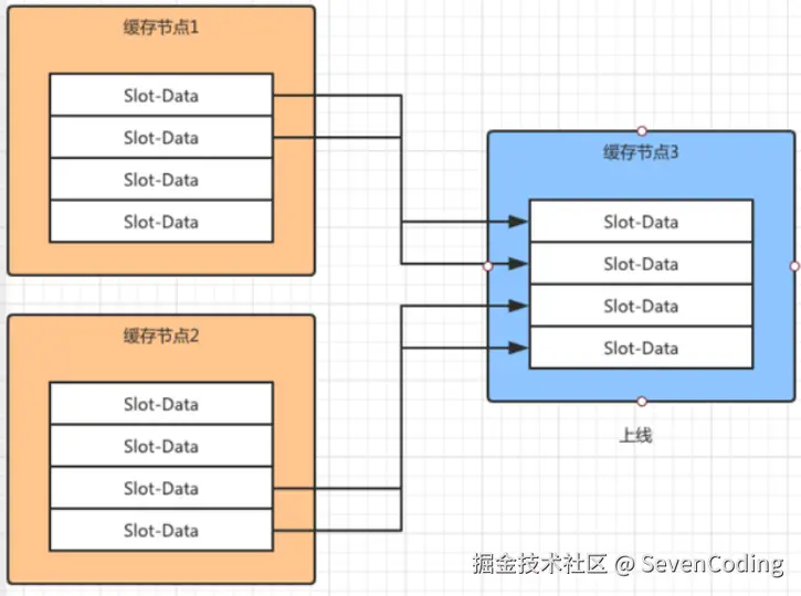 如上图所示,集群中本来存在“缓存节点1”和“缓存节点2”,此时“缓存节点3”上线了并且加入到集群中。此时根据虚拟槽的算法,“缓存节点1”和“缓存节点2”中对应槽的数据会应该新节点的加入被迁移到“缓存节点3”上面。