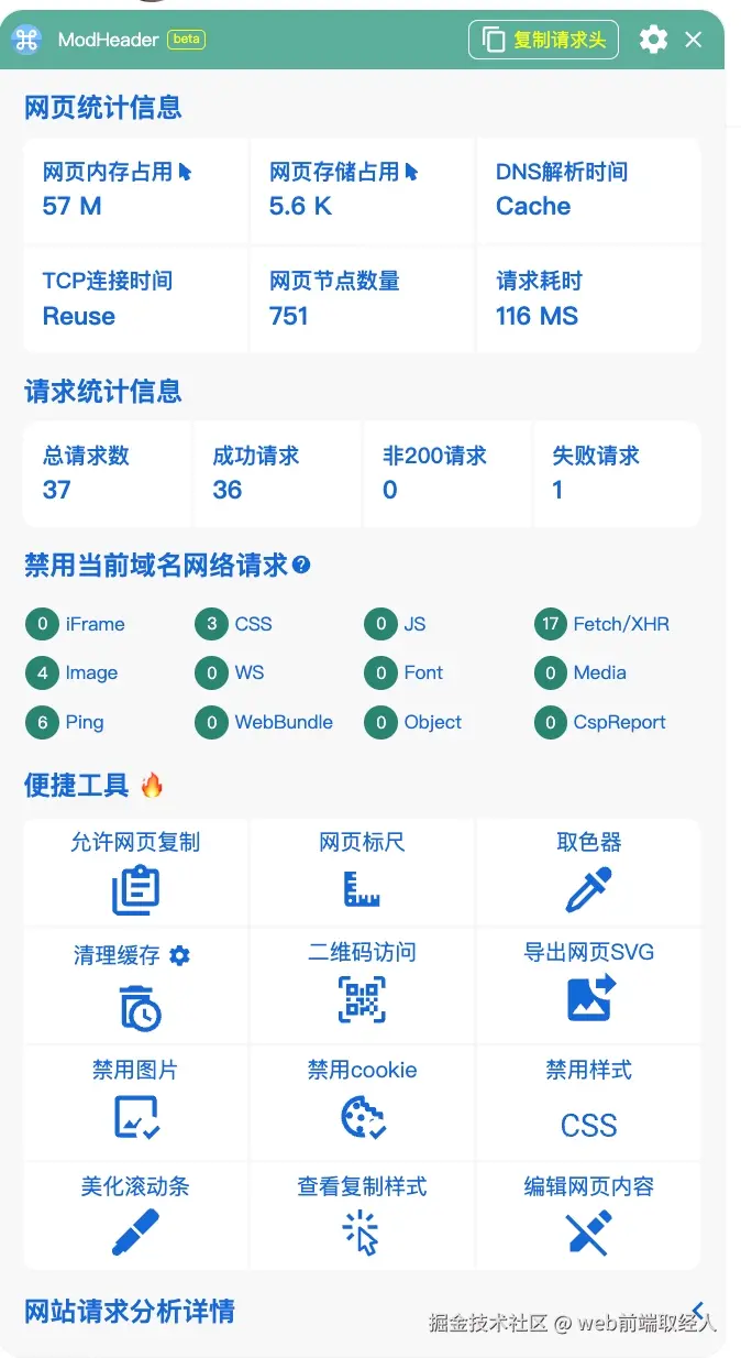 从上面图中我们可以看出,ModHeader这个插件还有许多的用处,比如:分析网页内存占用,网页存储占用,DNS解析时间,TCP连接时间,网页节点数量,请求耗时等等。还可以查看我们的请求统计信息,还有便捷工具,这里就不一一讲解说明了,有需要的小伙伴可以自行下载插件实际体验一下!