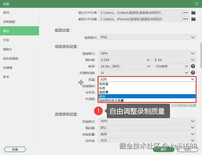 步骤2:进入 【设置】 中选择 【输出】 选项,可以自由调整视频录制的质量等录制参数,如可以录制出超高质量的视频。
