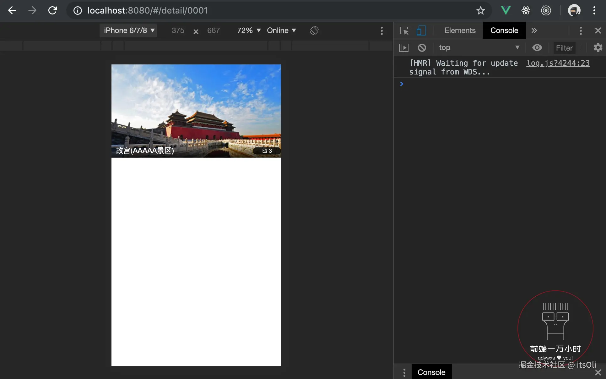保存后,返回页面查看。点击热销推荐的不同景点时,可跳转至详情页。由于路由中携带了参数,所以点击不同景点,可跳转至不同的详情页: