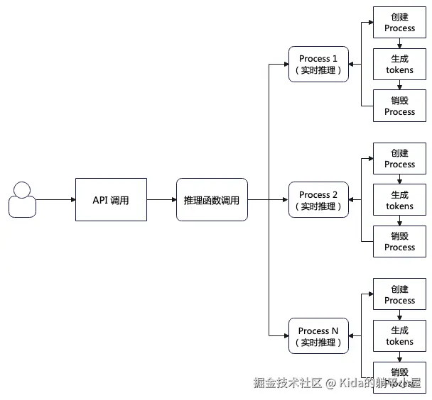 这个是当前的处理逻辑。用户调用 API,API 调用推理函数,推理函数就动态创建 Process 进程进行处理,虽然能够做到并发效果,但是每个 Process 都需要经历创建、执行推理、销毁三个环节,造成严重的资源浪费。那么有没有能够重复利用的独立进程呢?当然有,它就是 Pool(进程池)。