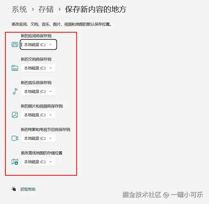 步骤2:选择【保存新内容的地方】,在其界面上将C盘更改为其他磁盘即可。