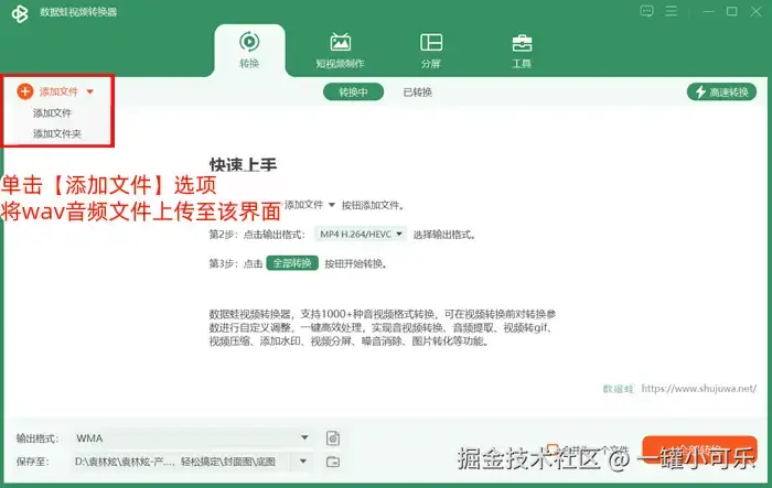 第一步:双击打开数据 蛙视频转换器,单击【添加文件】选项,将wav音频文件上传至该界面。