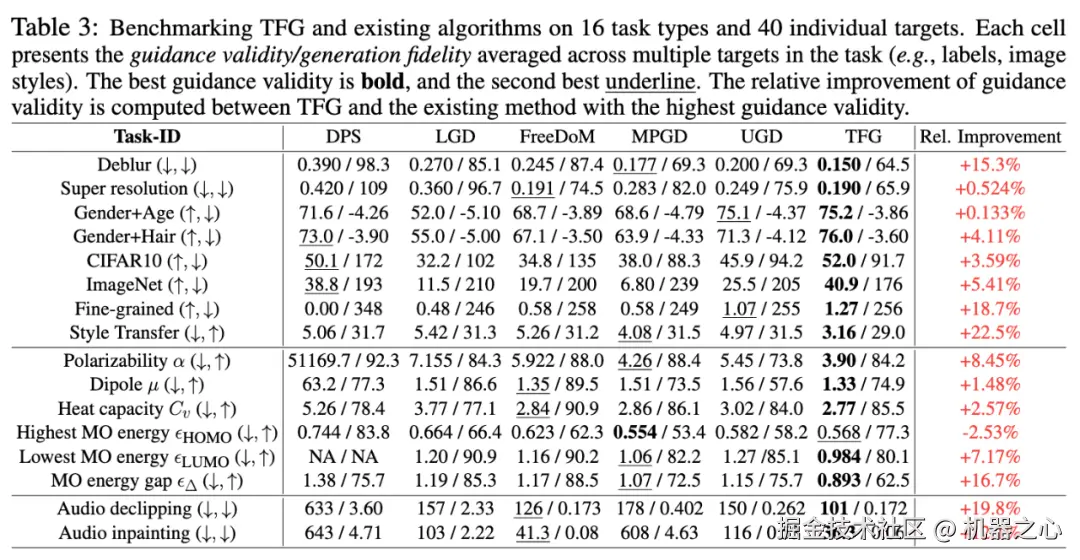 TFG 框架在 7 种扩散模型上开展了广泛的实验,包括图像、分子、音频等 16 项任务和 40 个具体目标。实验结果显示,TFG 平均性能提升 8.5%,在多个任务中均超越现有最佳方法。