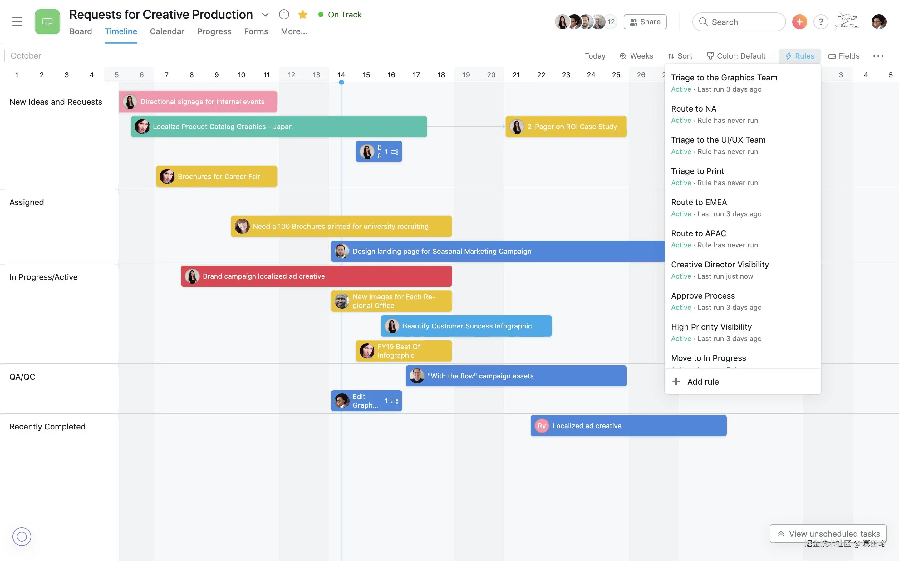Asana是一款多功能项目管理工具,其甘特图功能体现在“时间线”视图中,能够帮助团队将任务计划转化为清晰的时间计划。Asana界面简洁、操作简单,尤其适合对时间管理要求较高的团队。