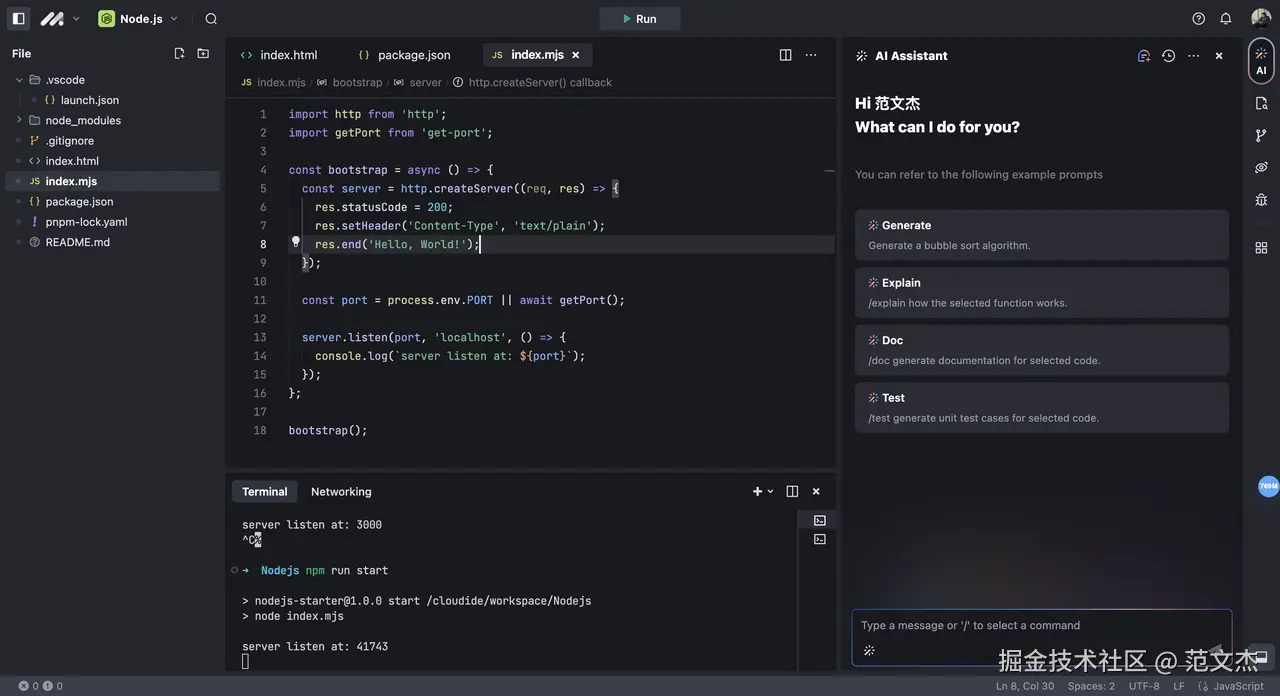 Web IDE 整体功能与 VS Code 插件趋近,同样提供了与 AI 对话的对话面板,同样支持生成代码、解释代码等能力,此处不再赘述。
